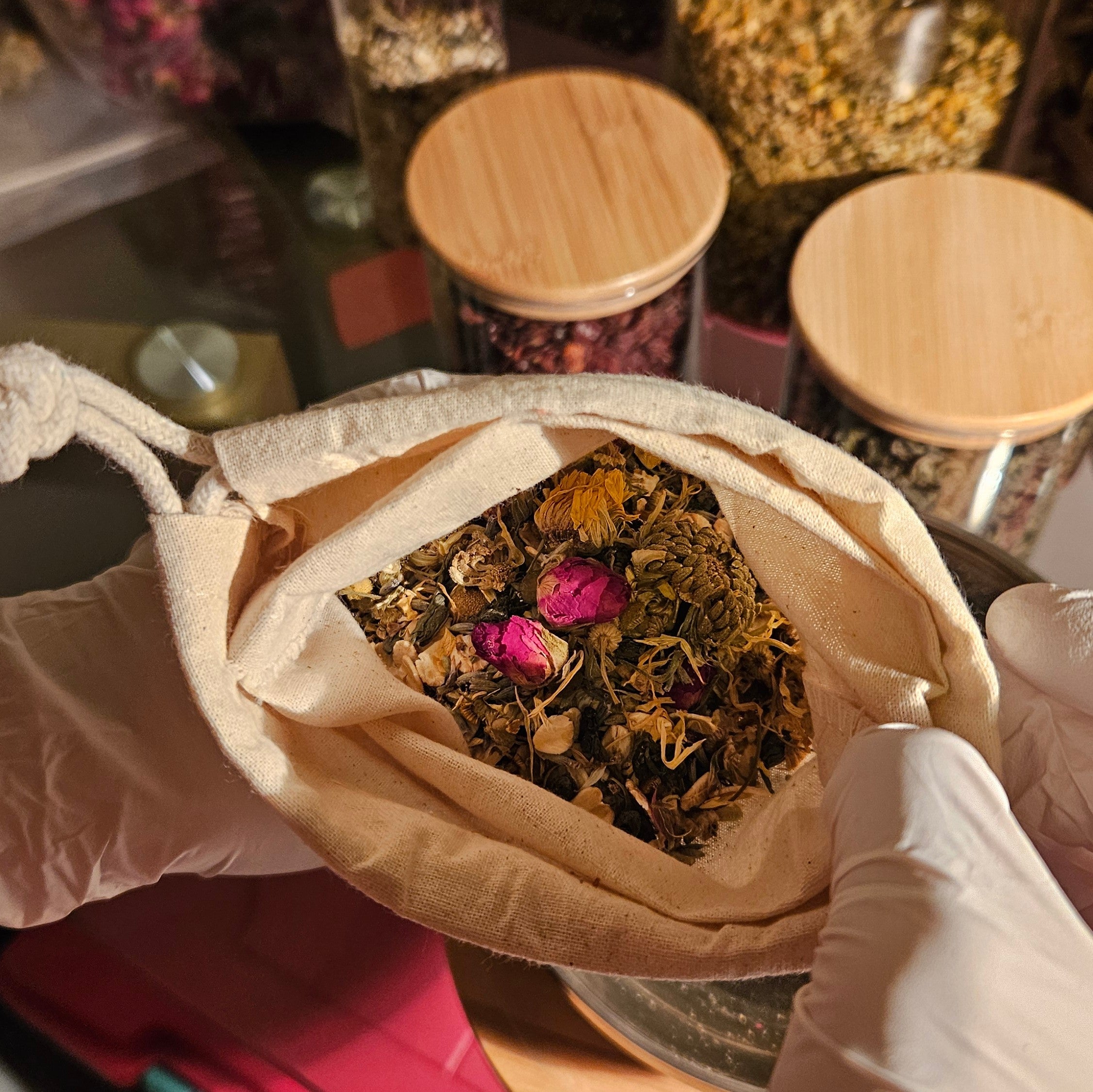 Es un baño infusionado con té, hierbas, flores y frutas deshidratadas. No es solo para limpiar el cuerpo, es una pausa para soltar el estrés y volver a ti. Un ritual de bienestar para el cuerpo, la mente y el corazón.